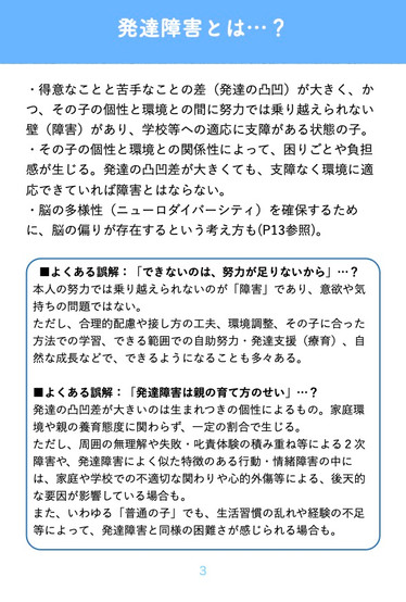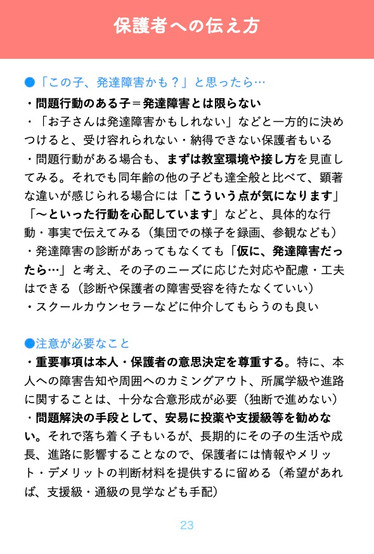通常学級の先生が大変ご多忙なのは重々承知してますので、要点のみ、大事なところのみを、できるだけ簡潔に端的にまとめました。例えば、プリントしてはがきフォルダーなどに入れて、困った時のハンドブック的にお使い頂けたらと思います(より詳細で正確な情報は専門書等をご参照ください)。